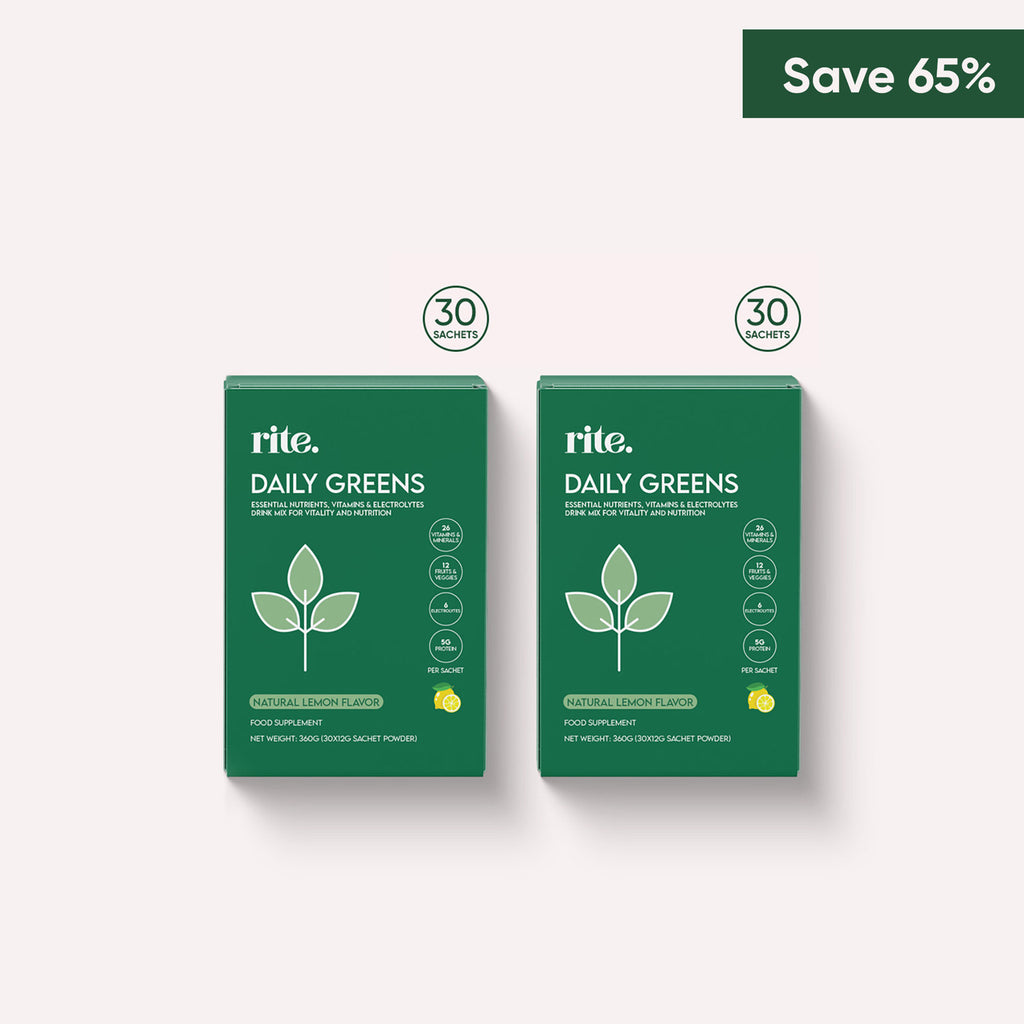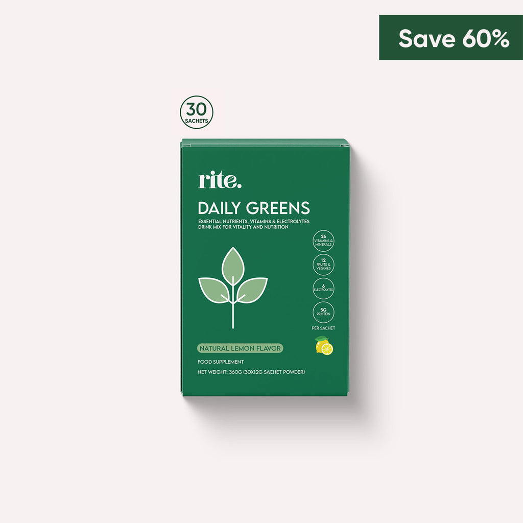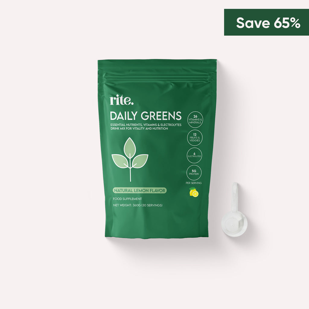 DAILY GREENS SUPPLEMENT (30 Pack) with rite. green box and sachet, offering lemon flavor, vitamins, and essential nutrients.